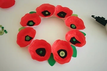 Glue your poppies around the paper plate ring and you will have your own poppy wreath. You can add paper leaves if you wish to. You could hang it on your door or put it on the wall of your bedroom to remind you of who we are remembering…